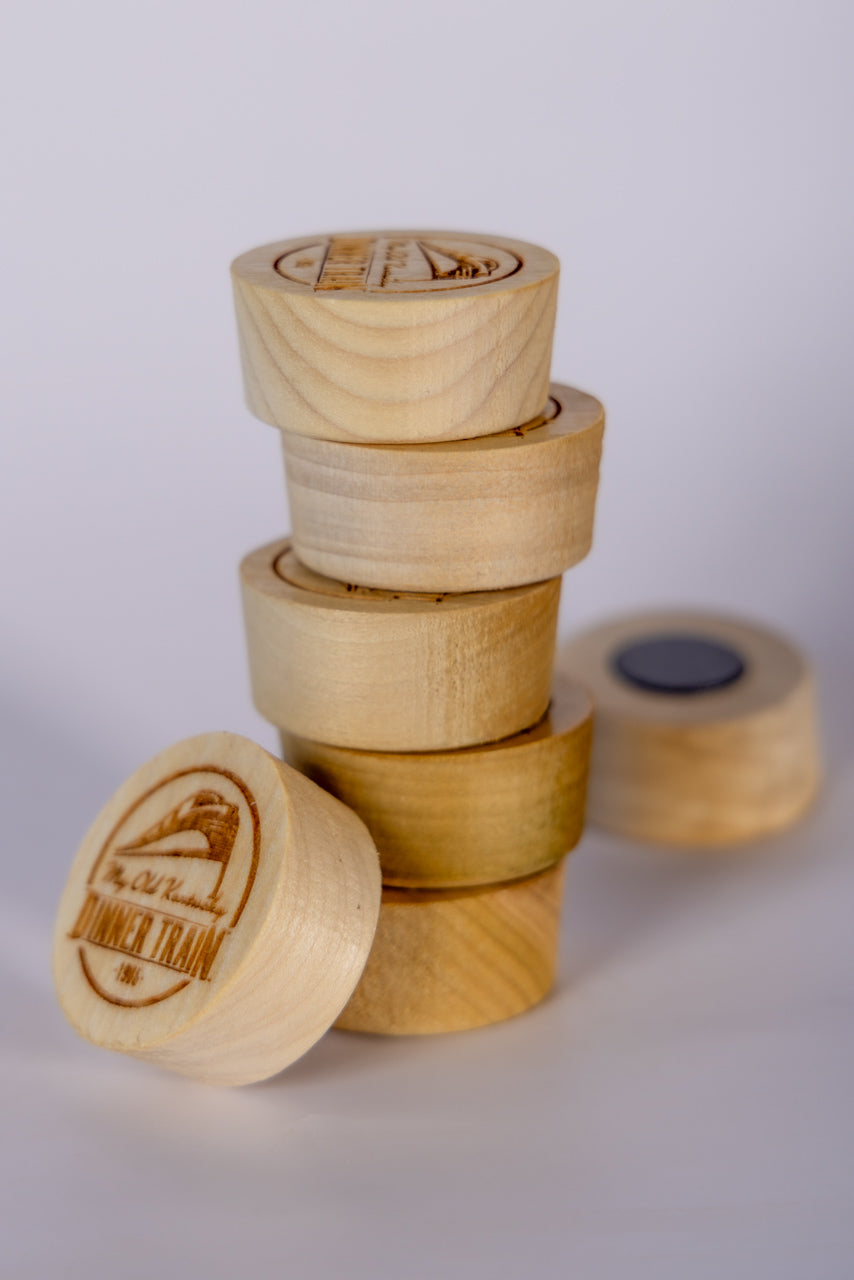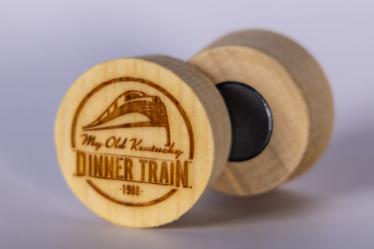 Bring a touch of authentic Kentucky bourbon tradition into your home or office with our handcrafted Bung Magnet. Each magnet is made from genuine poplar wood—the same traditional material used for the “bung hole” stoppers in real bourbon barrels. Measuring 2” wide by 1” thick, every bung is carefully engraved (approximately 1 3/4” wide) with the Dinner Train logo. A strong magnet is set into the back, making it both functional and decorative.